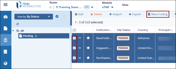 - Select the site(s) to apply mass coding by checking the box next to the site name.