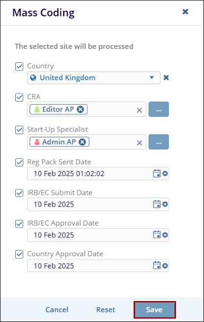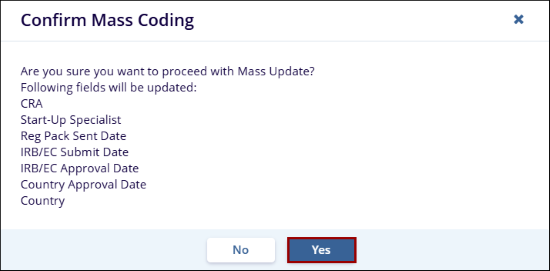 - In the Mass Coding dialog, select the relevant fields to code, such as Country, Expiration Date, CRA, Start-Up Specialist, or any other applicable fields, and fill in the details.