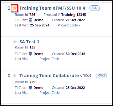 The left pane of the Home page lists all assigned rooms and displays key room details, including Room ID, Creation Date, Last Visit, Protocol, TI Client, and Project Code. Rooms can be marked as favorites using the Star icon.