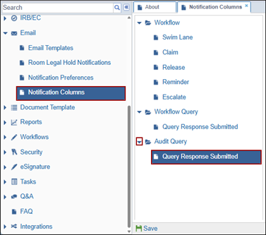 The Notification Columns are available for the following categories with sub-sections: