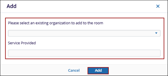 - Within the Add window, select an existing organization from the drop-down list labelled - Please select an existing organization to add to the data room.