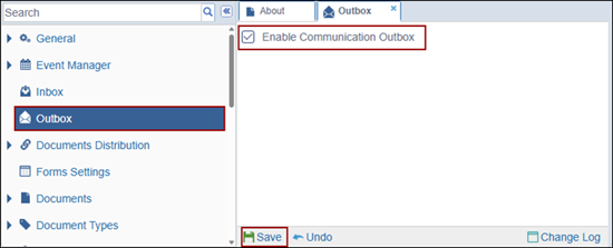 The Outbox Settings allows administrators to enable or disable the Communication Outbox feature. If enabled, users can access the Communications module from the navigation grid that supports an Inbox for receiving emails with document attachments and an Outbox for outgoing communications, along with the ability to send notification alerts. Additionally, it supports sending out notifications for communications.