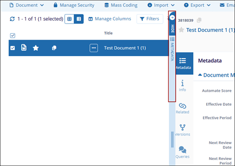 The Document Metadata panel allows users to view the document metadata and the document in separate panels in the eTMF/Document’s module.