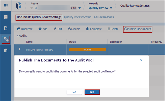 - Select an audit with Active status and click the Publish Documents button from the top menu bar.