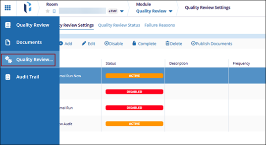 The Quality Review Settings tab allows users to configure audit profiles by defining the parameters and criteria required for document review. This includes creating audit profiles and assigning auditors, audit managers, and audit responders. Users can also configure quality review statuses and failure reasons, which auditors select when conducting audits.