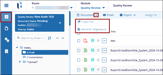 The Documents dropdown enables users to copy the link of the selected document and send the document for eSignature.