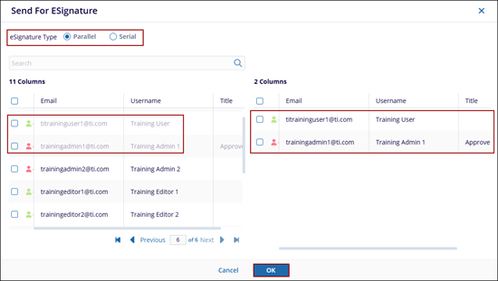 The Send for eSignature option enables users to route the selected document to designated recipients for electronic signature.
