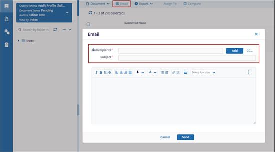 Selecting the Email option enables users to send messages to other room users, groups, or contacts. The email may be associated with a specific document or sent as a general communication.