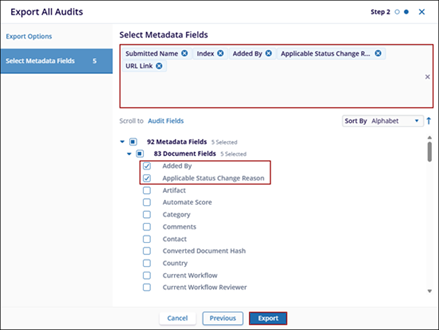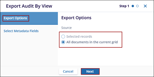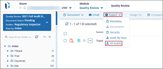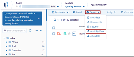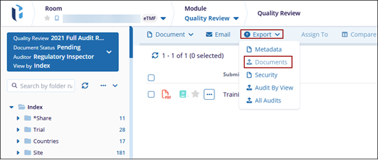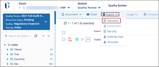 The Export option allows users to export Metadata, Documents, Security, Audit By View, or All Audits.
