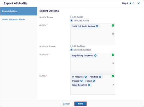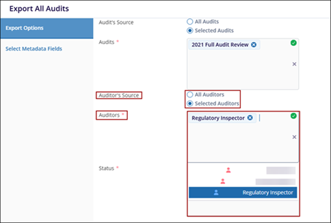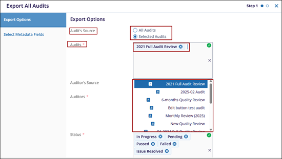 The Export All Audits refers to a comprehensive collection of audit records that includes all available audits. It typically encompasses the Audits Source, Audits, Auditors Source, Auditors, and Status.