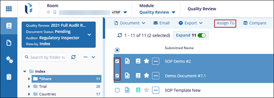 The Assign To option allows users to assign the selected documents to a specific auditor or automatically assign documents between the existing auditors.