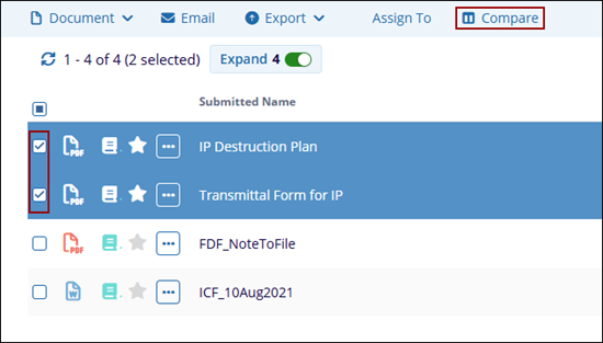 To compare documents, select two files with the same file extensions from the grid and click Compare in the top menu bar.
