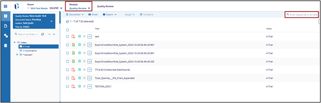 The search bar allows users to locate documents within the Quality Review module. Search results are dynamically refined based on the currently applied filters and sorting criteria.