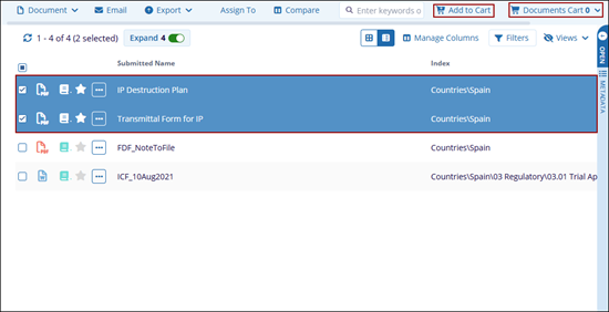 Users can select multiple documents and select ‘Add to Cart’ to add documents to the documents cart. Here users can perform multiple actions to the selected documents to the selected documents.