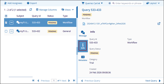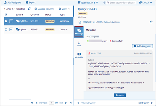 The Message tab within the query’s metadata panel displays the list of assigned users along with the message submitted by the query initiator. Query recipients can add responses and initiators can reply, add additional assignees, and mark the query as resolved when appropriate.