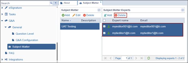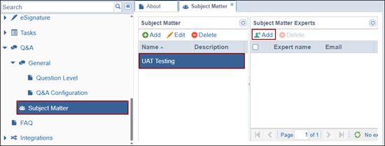 - Subject Matter Experts panel from which subject matter experts can be assigned to or unassigned from the specific subject matter categories.