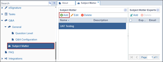 If Subject Matter is enabled in the Q&A Configuration, an additional setting for configuring the subject matter and subject matter experts is activated i.e., Subject Matter
