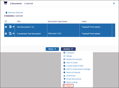 - On the Documents Cart window, click on the Actions dropdown and select the