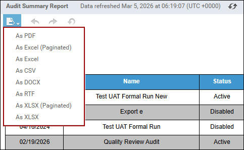 - Click the icon on the far left of the report page and select an option to export the report.