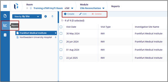 The Reports tab within CRA Reconciliation module functions as a centralized repository for reconciliation reports generated during site visits.