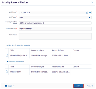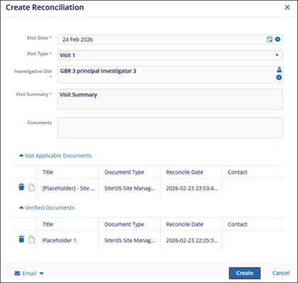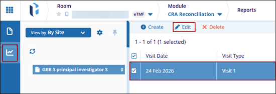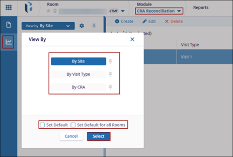 Within the Reports tab of the CRA Reconciliation module, users can filter and view reports by Site, Visit Type, or CRA using the dropdown menu on the left-hand panel. Users can also create new reconciliation reports by selecting a specific visit type and site, which will display the documents categorized as Verified and Not Applicable for that site. Additionally, users have the option to email either the complete report or only the list of documents identified as missing from the site binder. The generation of reports is possible only when the reconciliation activity has been performed.