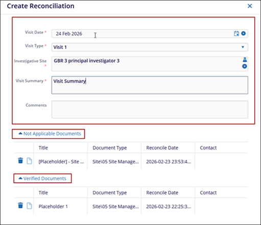 - Visit Type: Select a visit type from the dropdown. Note: The visit types configured in the CRA Visit Types section of the Settings module will be available for selection in the dropdown list.