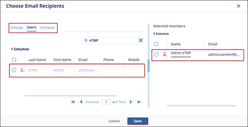 - Select the groups, users or contacts and drag & drop them to the Selected members section.