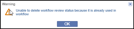 Note: If the selected status is in use within a workflow, a pop-up dialog will appear and the status will not be deleted.
