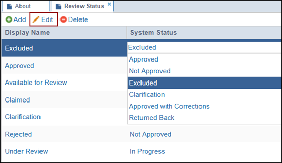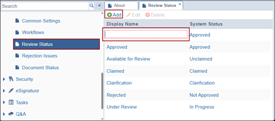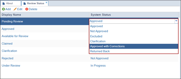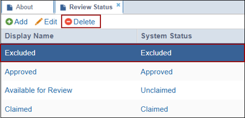 Within the Review Status section, administrators can add, edit, or delete statuses that