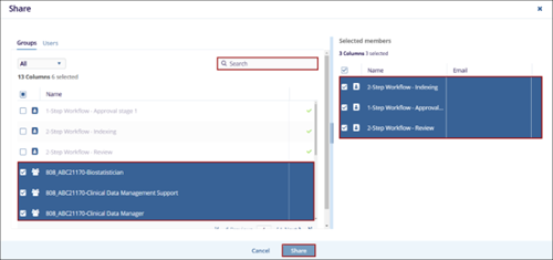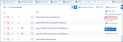Once the view has been saved, it can be shared with any other room user. This is particularly useful when a new team member is brought on, as they may not be familiar enough with Trial Interactive to easily find the necessary information via the Grid.