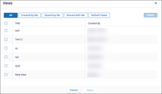 - To delete a view, select a view from the list and click the Delete button at the top right corner of the window.