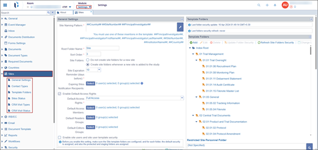 Within the Sites Settings section, administrators can define and manage configuration options for investigative sites participating in a clinical trial. These settings include the site naming pattern, associated folder structure, default access rights, contact types, site status values, and CRA visit types and corresponding statuses.