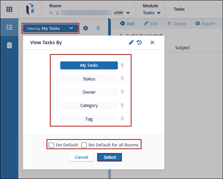 - Select the Set Default for all Rooms checkbox to apply the selected view as the default across all rooms.