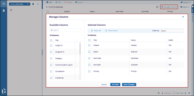 The Task section can be customized with the Manage columns allows users to customize the columns that appear in a data table and the Layout provides users with different data viewing options. The choice of layout can help enhance user experience by making the data available to navigate.