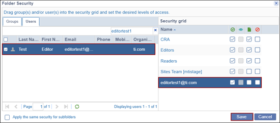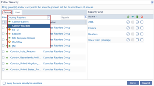 - Drag group(s) and user(s) into the Security grid and set the define the access levels by checking or unchecking the checkboxes.