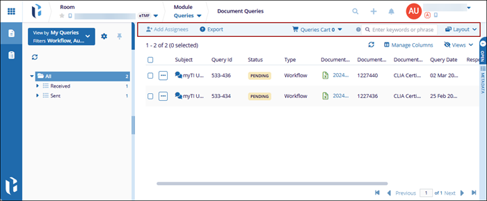 This menu is located at the top of the Document Queries and allows access to various functionalities such as: