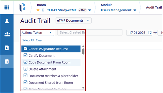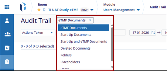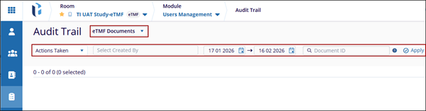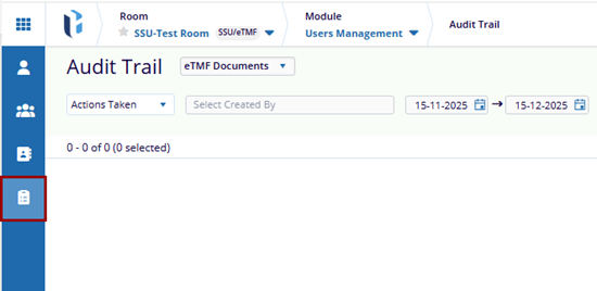 To access the Audit Trail modal within the eTMF module > User Management, click the Audit Trail icon in the left pane. This will open the Audit Trail screen.