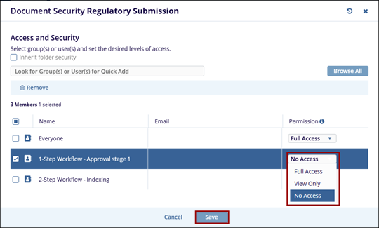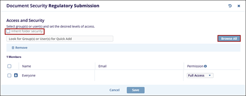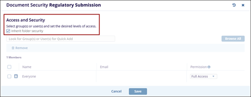 - The Documents Security window will display the users or groups with the access