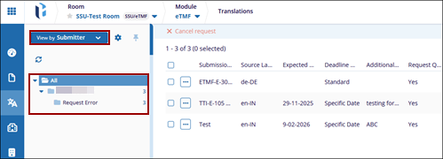 - Selecting any folder displays the related translation requests in the main grid.