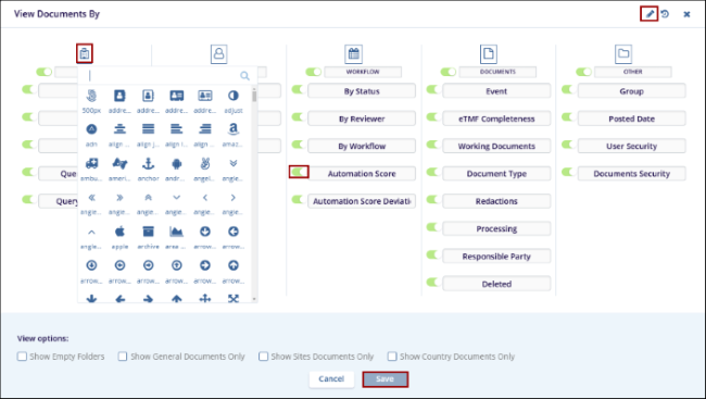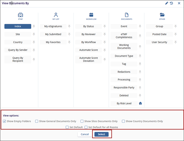 | eTMF Completeness | Organizes documents and placeholders by the related entity (e.g., Study, Countries, Sites, or IRB/EC). |